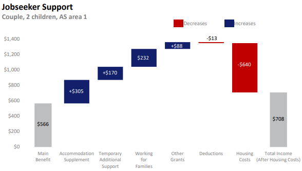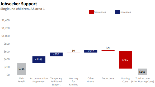 In this calculation $450 is nominated for a single person’s accommodation costs in a high rental area. This reflects a one-bedroom apartment in Auckland perhaps, but even then the sum is quite generous. All of the young people I know share flats and houses. And they have jobs. Most try and keep their accommodation costs below $200 per week. The example is very odd.