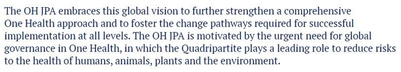 Fast forward another decade: during the Covid period a ‘quadripartite’ of four UN agencies – FAO, WHO, World Organization for Animal Health (WOAH) and the United Nations Environment Programme (UNEP) – was formed. The One Health High Level Expert Panel (OHHLEP) consists of academic and bureaucratic leaders in One Health ideology whose role is to provide strategic and scientific advice to the quadripartite “on One Health-related matters that support improved cooperation among governments”.