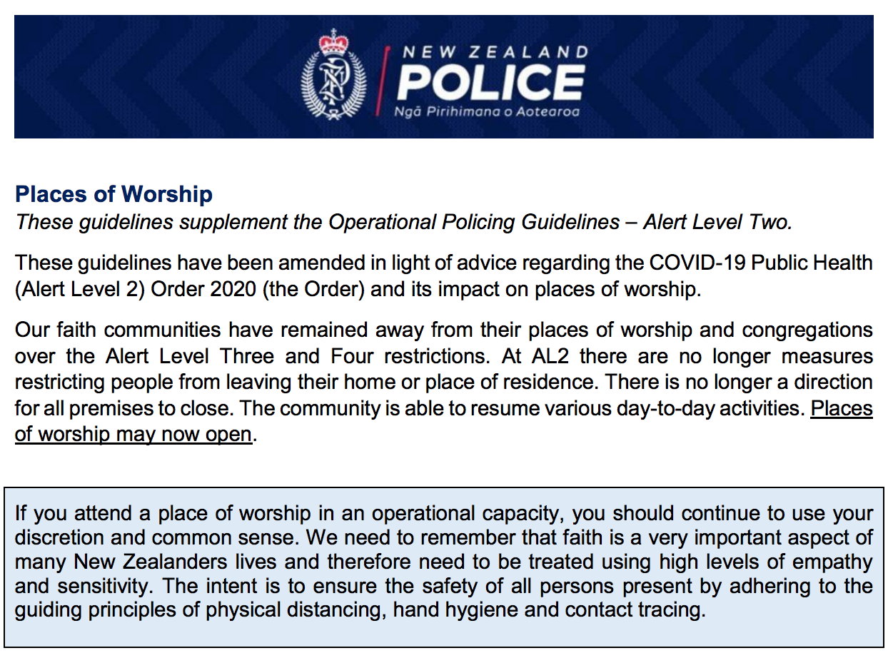 Places of worship may open under AL2. There are restrictions regarding the number of people who may “gather” within a place of worship. Unless people are kept 2m apart at any religious service (which would then not be a gathering), services are limited to groups of 10 (except for funerals and tangihanga) and (except for gatherings of friends and whanau) records would need to be kept for the purposes of contact tracing.