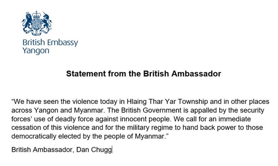 This is the British reaction to the actions of the authorities today. (Nothing heard from New Zealand). The Embassy is on Strand Road in downtown Yangon and the Residence is near the main railway station, so they are well placed to observe what is going on in the commercial district. Hlaing Thar Yar is an industrial district in West Yangon and is home to many factories, including foreign-owned garment premises. The latest number of deaths today in Hlaing Thar Yar is 18 of which 10 were headshots. Unconfirmed reports put the number of deaths nationally at 30+.