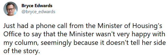 Last Thursday, April 1st, Dr Bryce Edwards, political analyst in residence at Victoria University of Wellington, ruffled the very considerable plumage of species Iratum dominae – better known to us as Megan Woods, Minister of Housing, earning him a personal rebuke: