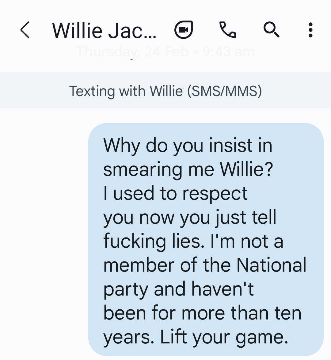 I’ve had a reasonable relationship with Willie Jackson in the past, appearing numerous times on his radio shows, and appearing on several of his television shows. So I sent him a text message to tell him to lift his game and to stop telling lies about me: