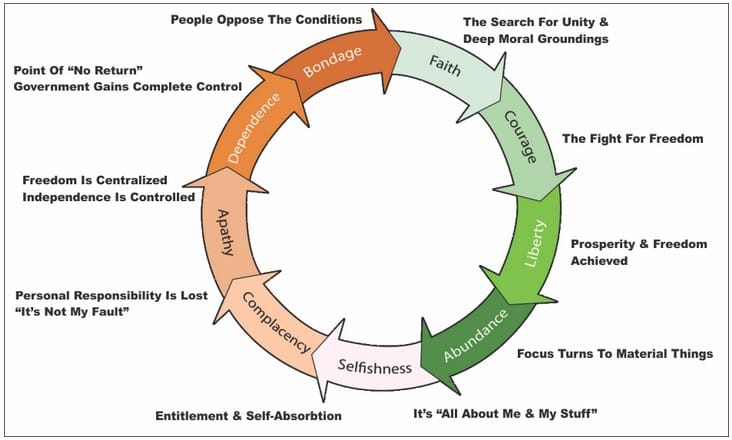 The average age of the world’s greatest civilizations from the beginning of history has been about 200 years. During those 200 years, these nations always progressed through the following sequence.