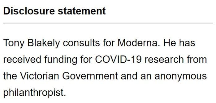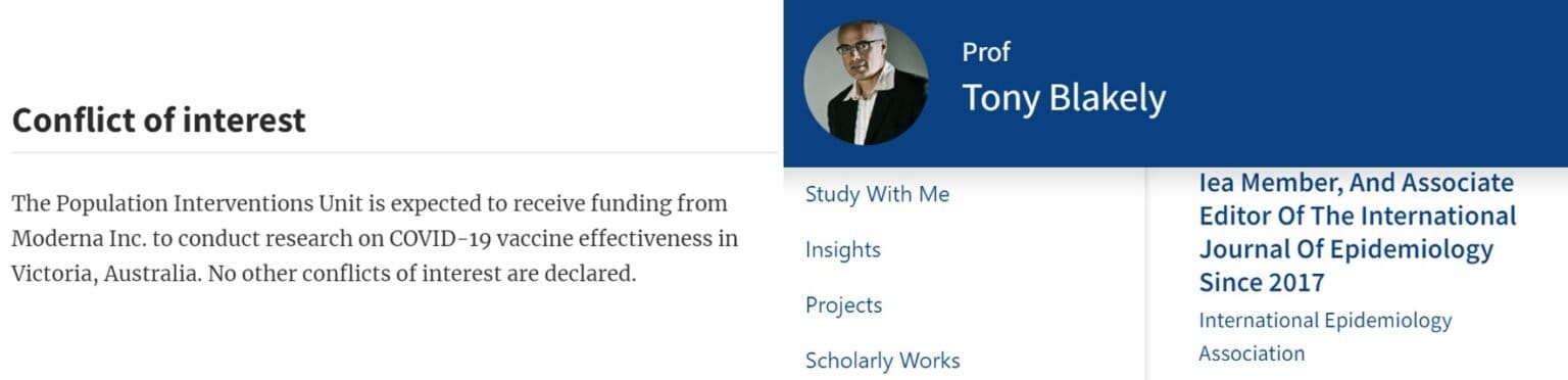 We first learned of Tony Blakely’s associations with Moderna via Lynda Wharton of The Health Forum NZ and videographer Coronavirus Plushie. His co-Commissioner, another lockdown proponent and previous World Bank Executive Director John Whitehead, explained to Michael Laws on The Platform (at around 13m), that everyone has conflicts of interest and these are easily resolved by ensuring the conflicted party abstains from certain meetings.