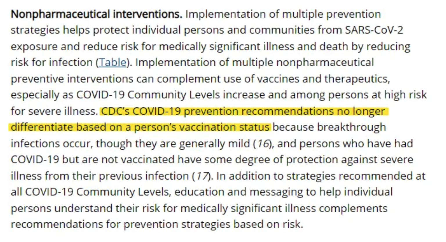 CDC’s COVID-19 prevention recommendations no longer differentiate based on a person’s vaccination status because breakthrough infections occur, though they are generally mild, and persons who have had COVID-19 but are not vaccinated have some degree of protection against severe illness from their previous infection.