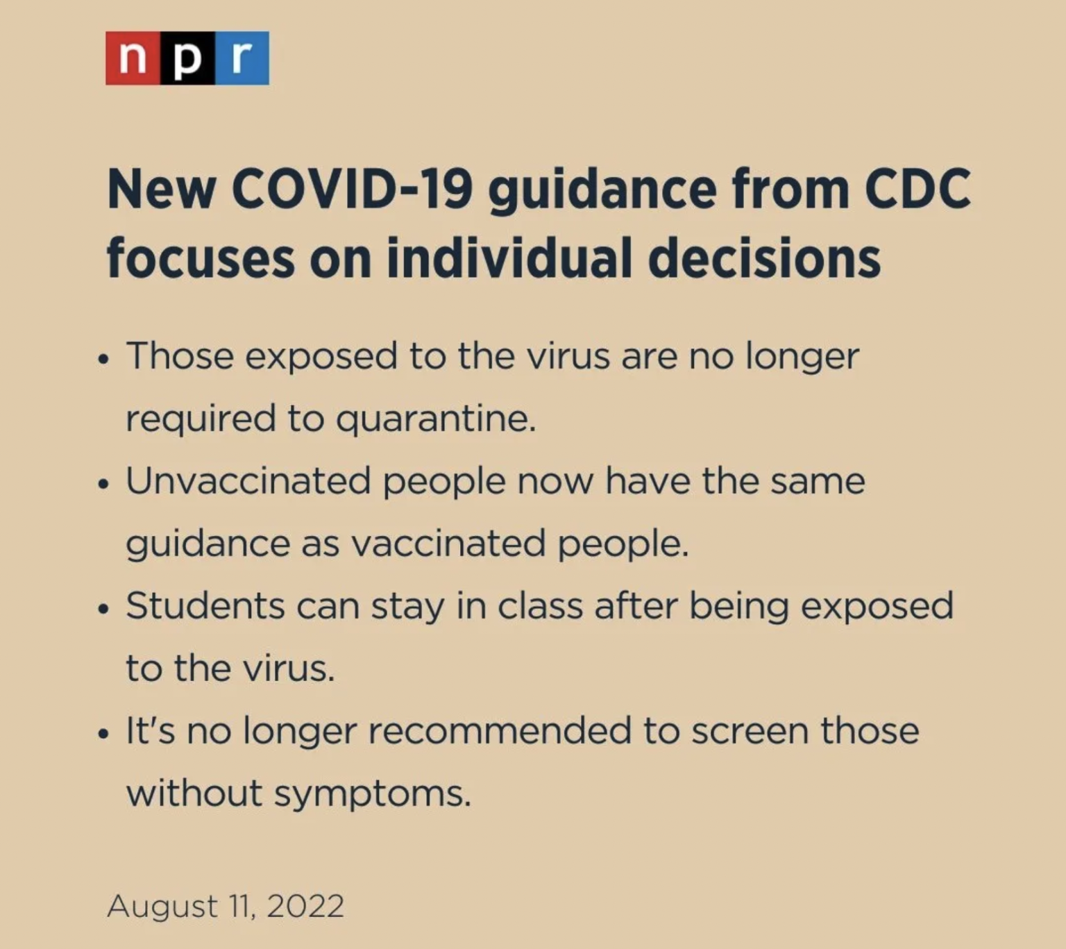 Both prior infection and vaccination confer some protection against severe illness, and so it really makes the most sense to not differentiate with our guidance or our recommendations based on vaccination status at this time.