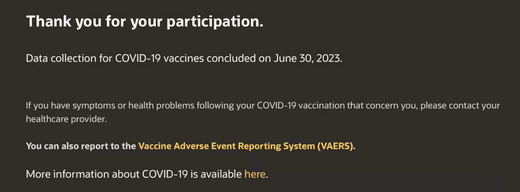 The Centers for Disease Control and Prevention (CDC) V-safe website quietly stopped collecting adverse event reports with no reason or explanation. The V-safe website simply states: “Thank you for your participation. Data collection for Covid-19 vaccines concluded on June 30, 2023.” If you go there today, V-safe directs users to the FDA’s VAERS website for adverse event reporting, even though officials continually derided VAERS as “passive” and “unverified.”
