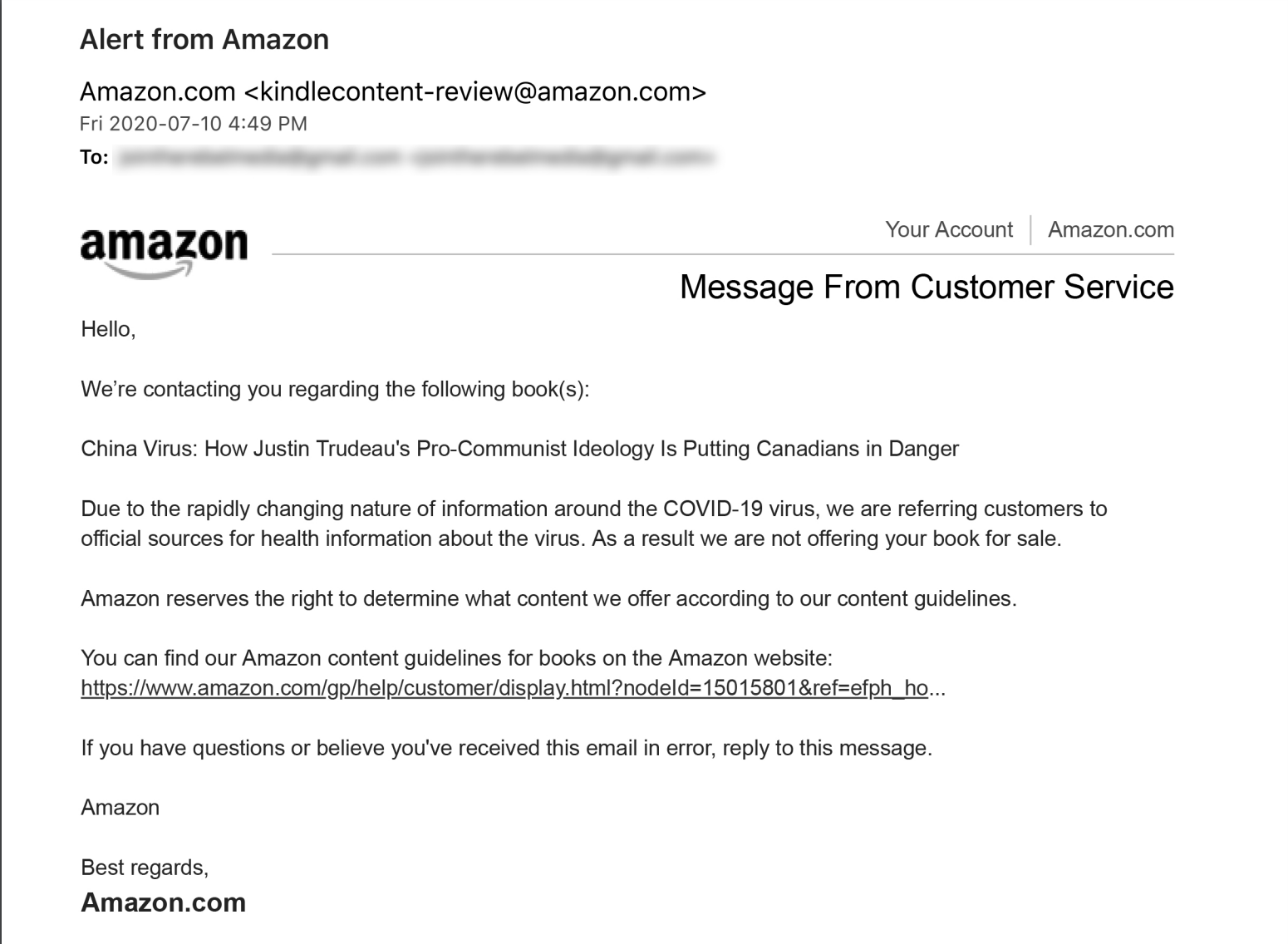 One hour ago, Amazon deleted the book, China Virus. They banned it. You can see their terse e-mail below.