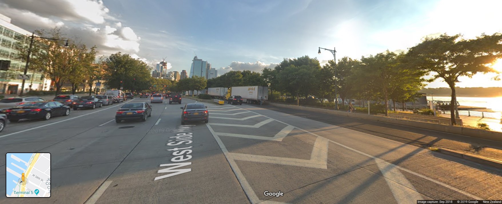So how is the West Side Highway in New York getting on with all the water covering it? Fortunately we have Google Streetview to save us increasing our carbon footprint on a fact-finding mission. The print is a little small, but it says, “Image capture September 2018.”