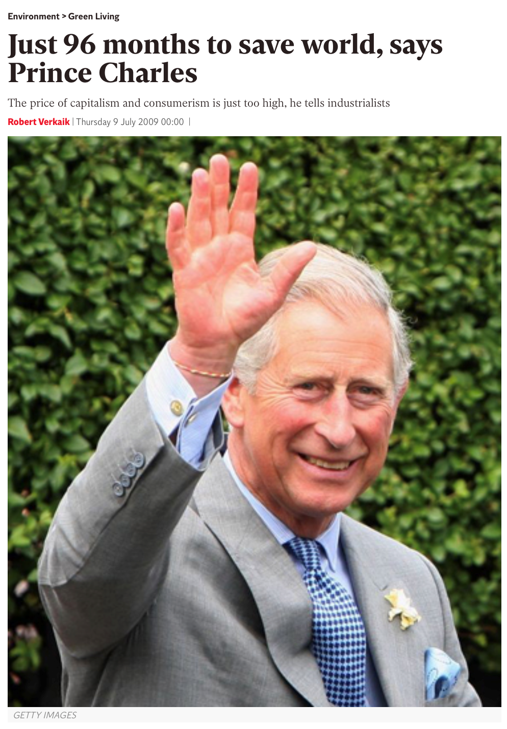 The heir to the throne told an audience of industrialists and environmentalists at St James’s Palace last night that he had calculated that we have just 96 months left to save the world.