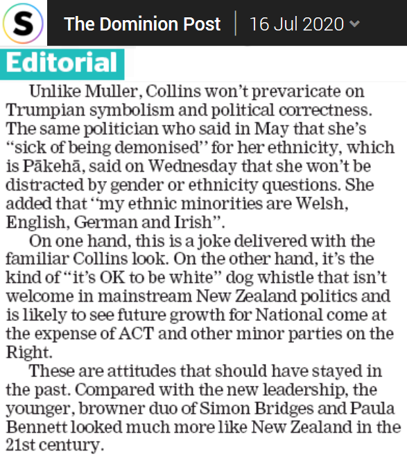 Suffice it to say the diatribe carries all the expected cliches: divisive, baggage, associations with shadowy attack-bloggers, along with “cartoonish Thatcherite toughness”, but they get around to what really irks them in the final run of the Disparaging Stakes. In the closing three paragraphs, we learn that “pakeha” is an ethnicity (yes, really), that Collins is one, to her utter discredit, and that’s the very nub of the issue. Good grief, how do those people become so sad?