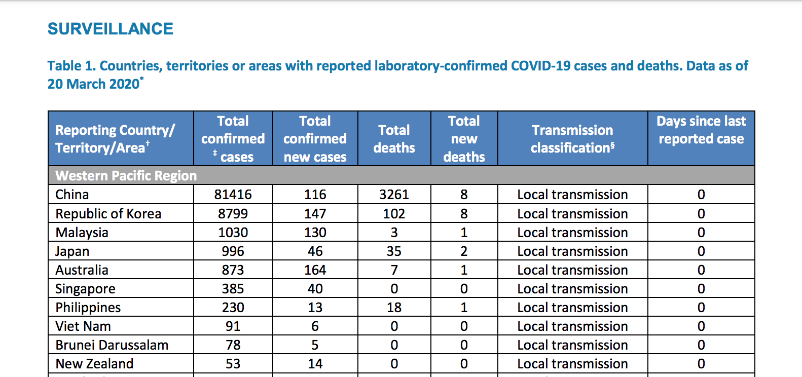 Editors Note: The following chart and PDF that appears to be from the World Health Organisation was sent to The BFD today anonymously so I cannot confirm their accuracy. The person who sent it to us claims that New Zealand has had confirmation of community transmission since 20/3/2020.