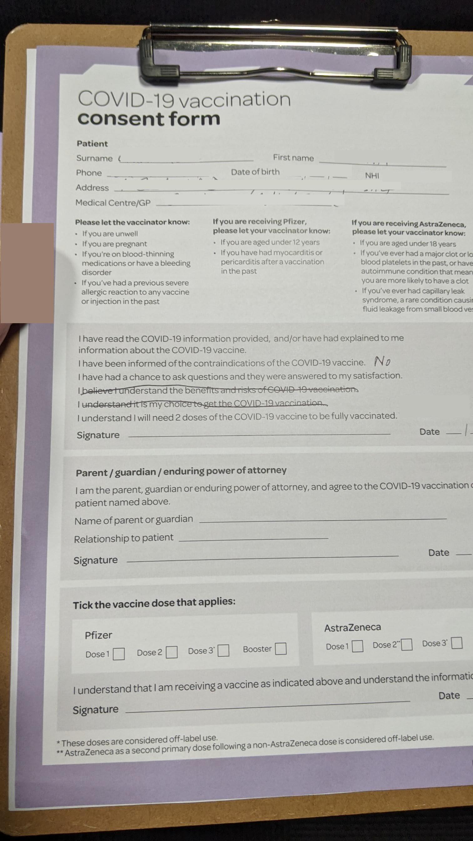 That got a “No” with a signature beside it as no one told me, or could tell me, what the contraindications of the vaccine are in 1, 2, 5 or 10 years’ time.