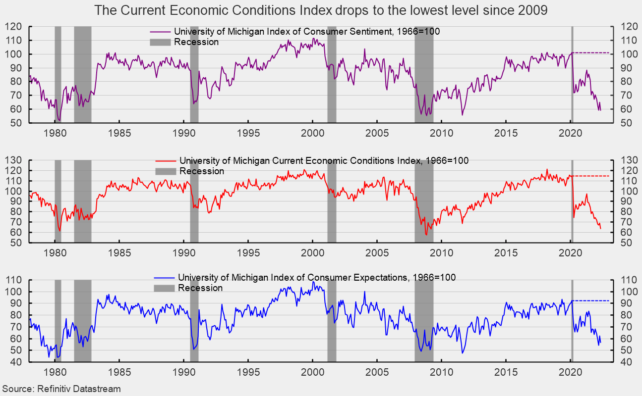 According to the report, “These declines were broad based – for current economic conditions as well as consumer expectations, and visible across income, age, education, geography and political affiliation – continuing the general downward trend in sentiment over the past year.” The report goes on to add, “Consumers’ assessment of their current financial situation relative to a year ago is at its lowest reading since 2013, with 36 per cent of consumers attributing their negative assessment to inflation.” Furthermore, “Buying conditions for durables reached its lowest reading since the question began appearing on the monthly surveys in 1978, again primarily due to high prices.”