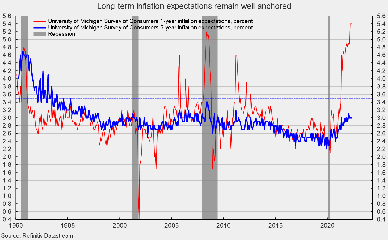 The weakening trend in consumer attitudes reflects a confluence of events with inflation leading the pack. Persistent elevated price increases affect consumer and business decision-making and distorts economic activity. Overall, economic risks remain elevated due to the impact of inflation, the start of a Fed tightening cycle, the Russian invasion of Ukraine and renewed lockdowns in China. The ramping of negative political ads as the midterm elections approach may also weigh on consumer sentiment in coming months. The overall economic outlook remains highly uncertain.