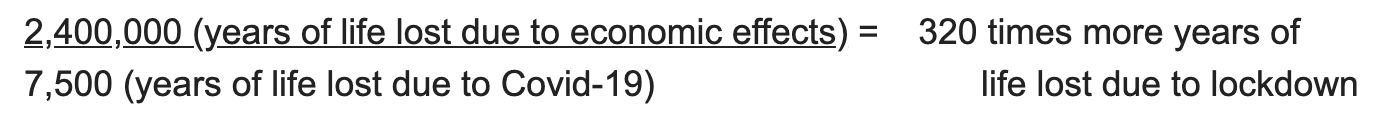 - In the best-case scenario that can be made for lockdown, it is at least 300 times worse than the virus itself. For example, in the worst (realistic) case of a completely uncontrolled release of Sars-Cov-2 in New Zealand it would kill 5,000,000 (population) x 0.3 (30% herd immunity) x 0.0025 (IFR) = 3,750. Each of these people would lose an average of 2 years of life (at the absolute most) = 7,500 years of life lost. For every 1% of GDP NZ loses our life expectancy drops ~0.1 years, so at our government’s (absurd) projection of just a 4.8% loss of GDP, due to the lockdown they put in place, it equals 5,000,000 x 0.48 (years of life lost per person) = 2,400,000 years of life lost.