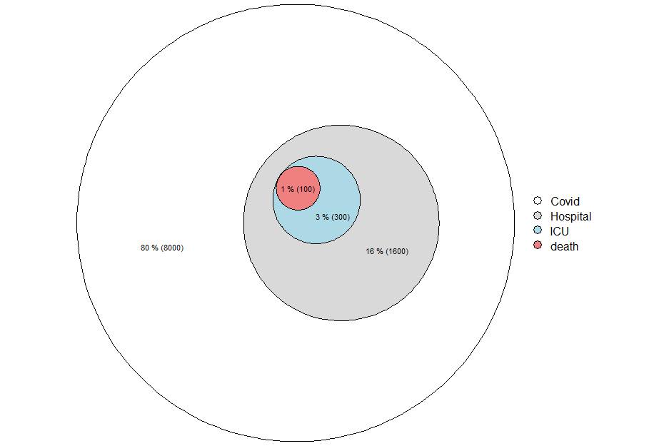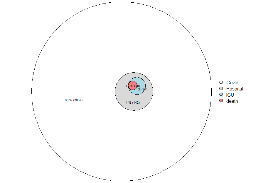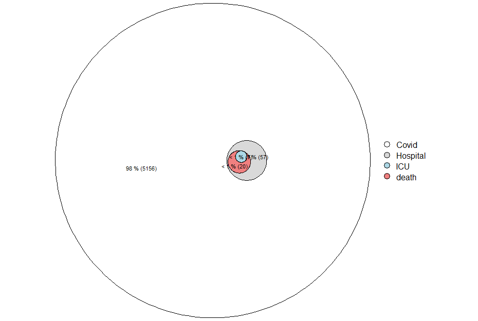 The difference in severity of covid-19 conveyed by Professor Jackson compared to observed data may be displayed in Euler diagrams consisting of concentric circles whose areas represent numbers in each category of severity below (figure 1 for Jackson’s estimates, figure 2 for current government figures and figure 3 for pre-vaccine era figures). In each figure, the area of the outer circle is proportional to the total count of covid cases, the grey indicate those who needed hospital treatment, the light blue intensive care and the red deaths (taken as 1% case-fatality for Professor Jackson, and estimated by using 5,213 current cases * 41 deaths/10,789 cumulative cases in New Zealand (11/November/2021)).
