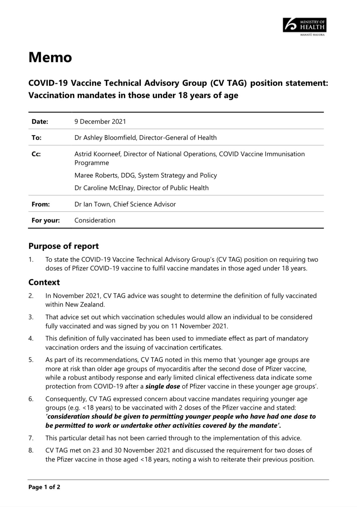 On 9 December the Chair of CV TAG, Dr Town, issued a strongly worded memo setting out the medical advice of our experts to the Director-General of Health, Dr Bloomfield. It was titled ‘COVID-19 Vaccine Technical Advisory Group (CV TAG) position statement: Vaccination mandates in those under 18 years of age’.