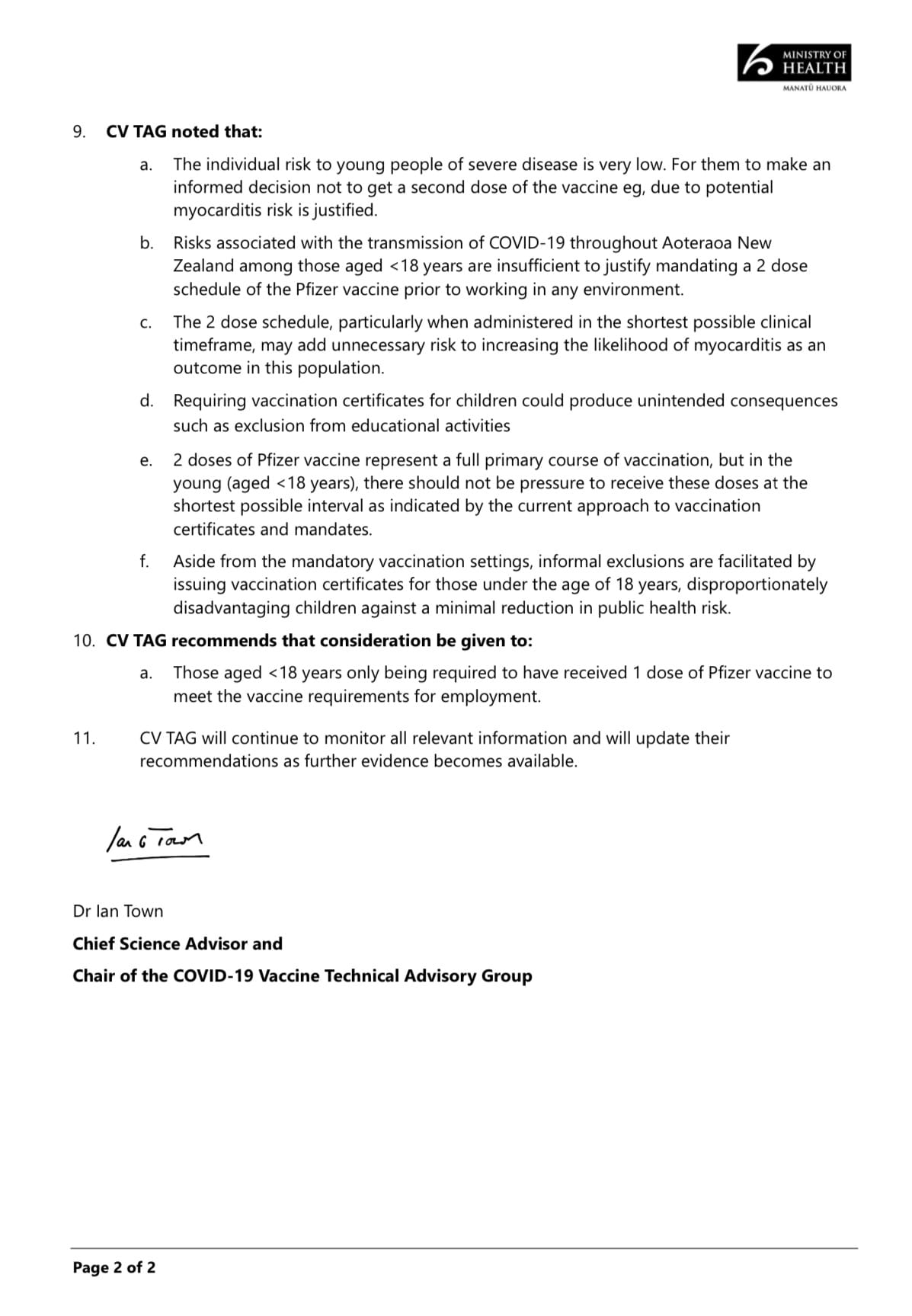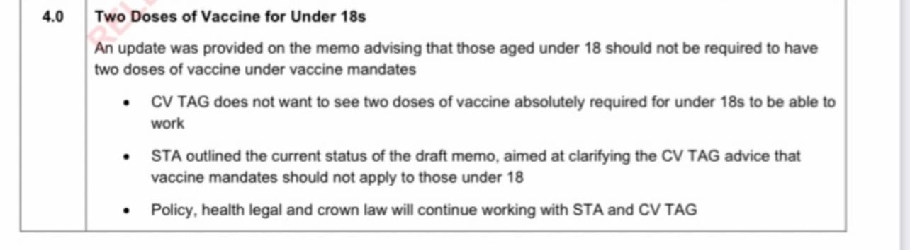 It goes on to state “consequently, CV TAG expressed concern about vaccine mandates requiring younger age groups (e.g. <18 years) to be vaccinated with 2 doses of the Pfizer vaccine and stated: ‘consideration should be given to permitting younger people who have had one dose to be permitted to work or undertake other activities covered by the mandate’. This particular detail has not been carried through to the implementation of this advice”.