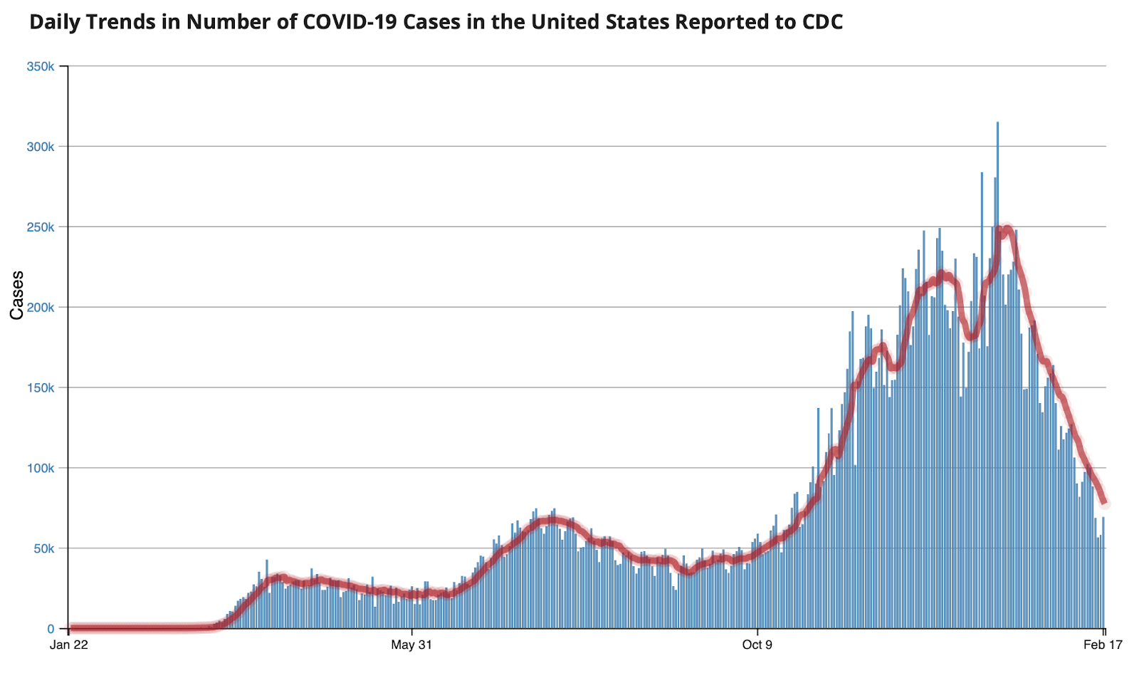 It’s not just political careers that are dropping like stones. The same is happening to Covid cases in the U.S.. The trend seems to defy prediction from January 20, 2021: the new US president said this about Covid-19: “things would get worse before they get better.” Then something very interesting happened. The number of cases of recorded infections of SARS-CoV-2 took a startling dive, falling fully 80% from the daily high on January 8th.