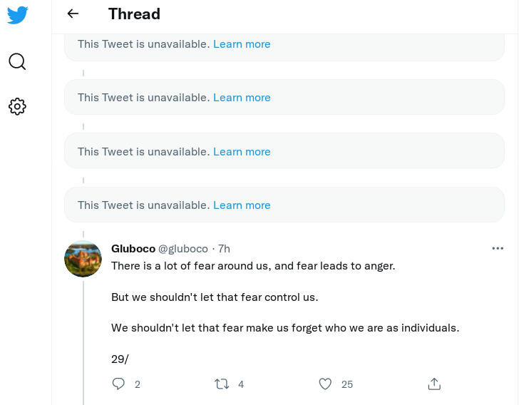 But after a few hours, the thread was partially blocked. From my account, I can see the thread with no problem. But other people see a thread with most of the tweets marked “unavailable”. It seems I was “shadow-banned“.