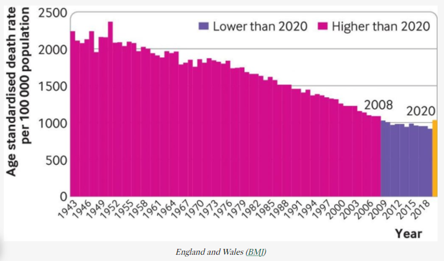 The Institute and Faculty of Actuaries have taken the deaths for England and Wales each year, adjusted for age and population size, to show the last ten years to be the least deadly in history with last year (the year of the pandemic) not as bad as 2009 or any year prior. The death rate last year was better than 2008 and every year before that.