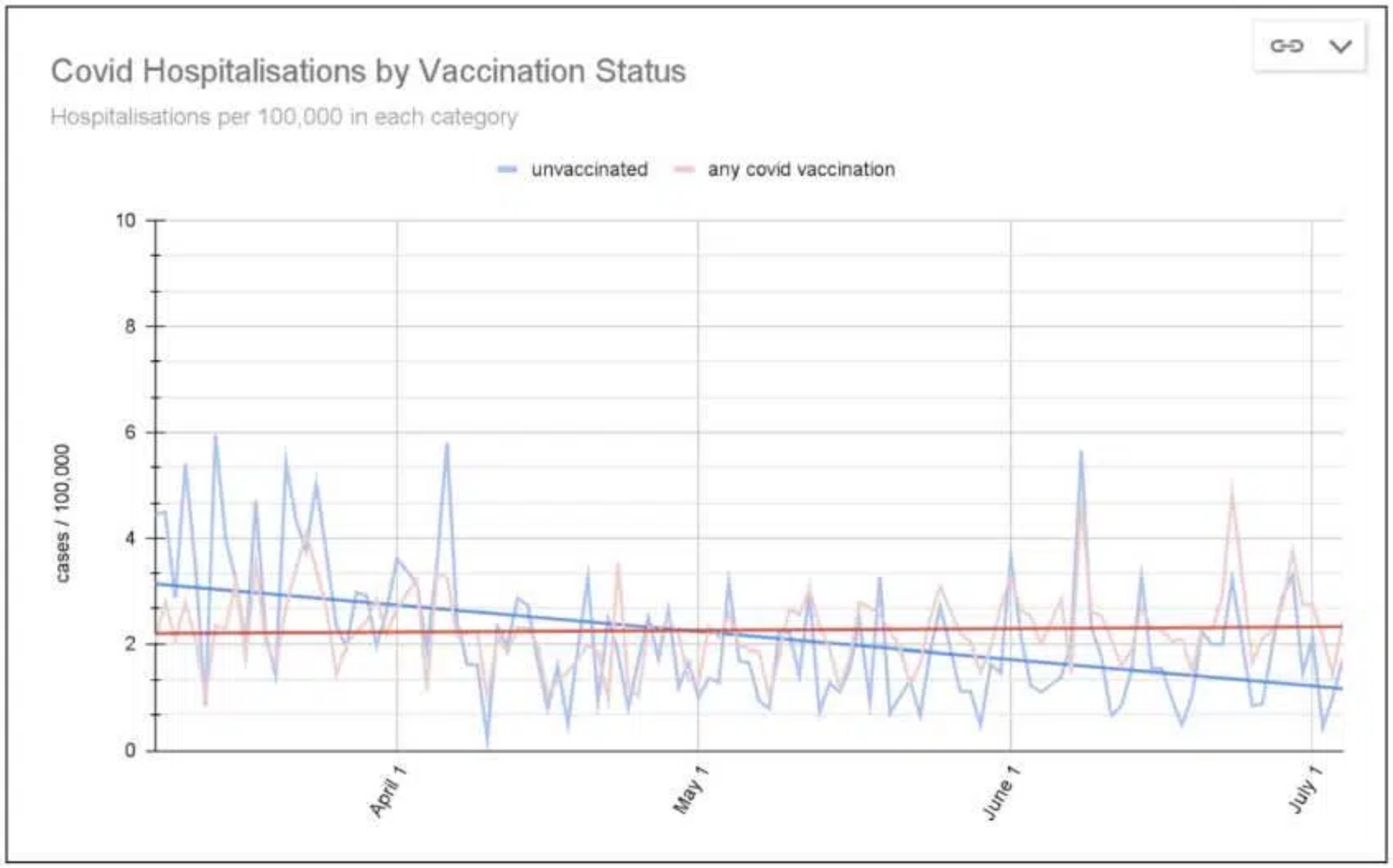 Over the last four months the vaccinated are becoming progressively more vulnerable to testing positive for Covid before or during hospitalisation (red line) while the unvaccinated are becoming less vulnerable (blue line).