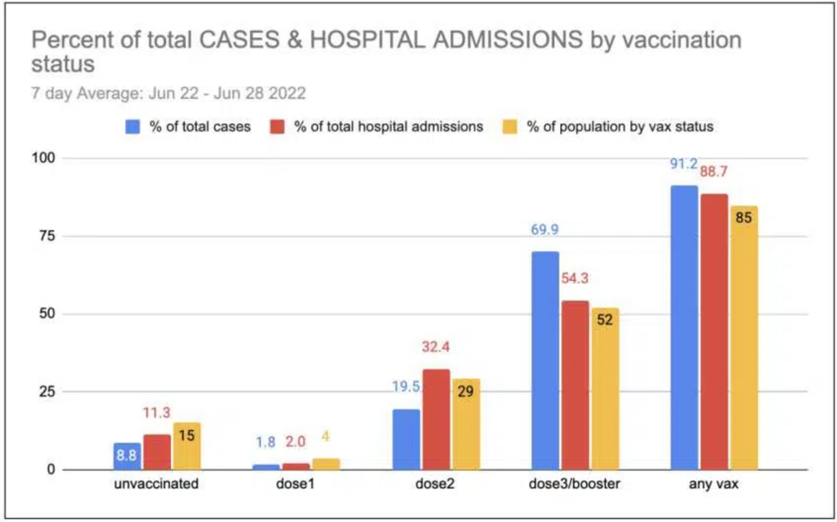 The most recent seven-day average reveals that the vaccinated make up a larger percentage of hospitalisations than their percentage of the population. In other words, they are more vulnerable to Covid than the unvaccinated, who make up a smaller percentage of the hospital admissions than their relative population size.