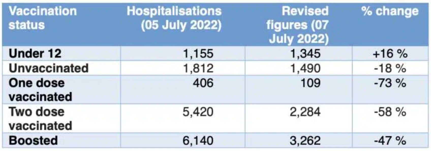 Before yesterday’s changes, the unvaccinated or ineligible formed 21.5 per cent of the population but only 17.5 per cent of the hospitalisations: they have now been recategorised and form 33.4 per cent of hospitalisations.