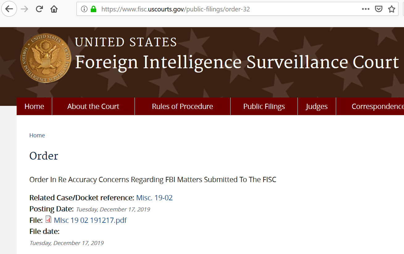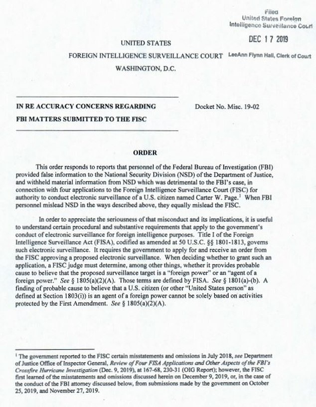 ORDER This order responds to reports that personnel of the Federal Bureau of Investigation (FBI) provided false information to the National Security Division (NSD) of the Department of Justice, and witheld material information from NSD which was detrimental to the FBI’s case, in connection with four applications to the Foreign Intelligence Surveillance Court (FISC) for authority to conduct electronic surveillance of a U.S. citizen named Carter W. Page. When FBI personnel mislead NSD in the ways described above they equally mislead the FISC. In order to appreciate the seriousness of that misconduct and its implications…