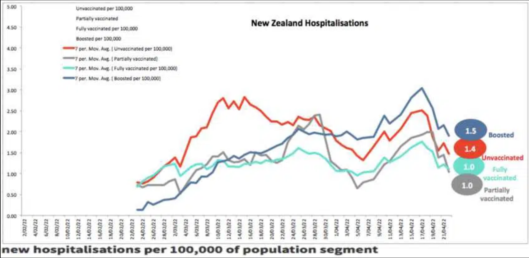 The actual New Zealand situation is quite different, the unvaccinated were less likely to be hospitalised than the boosted. Thank you to Grant Dixon for compiling and graphing New Zealand Ministry of Health data, below.