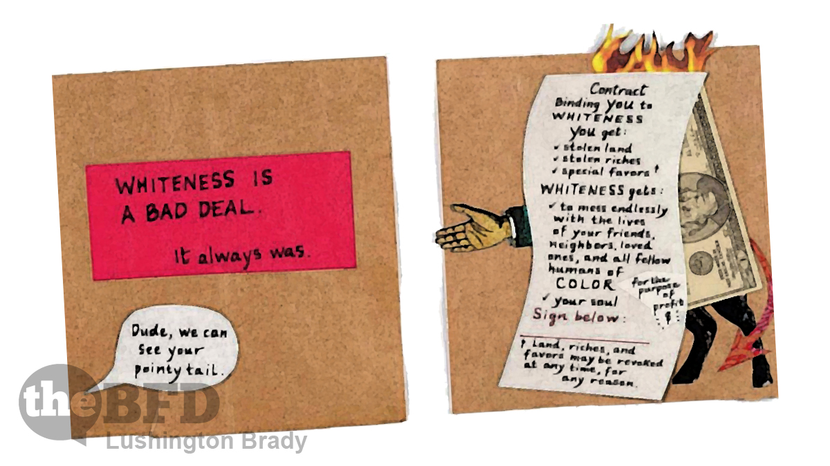 According to the whiteness contract, signees are promised “stolen lands,” “stolen riches,” and “special favors.” In return, whiteness gets to “mess endlessly with the lives of … all fellow humans of color for the purpose of profit” — oh, and “your soul.”