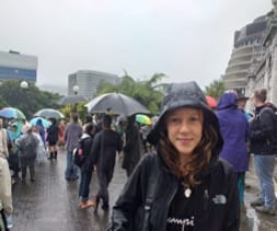 Billie and Ellie are University of Auckland second-year students who were attempting to keep warm wrapped up together in the torrential rain. Billie has an Autoimmune condition and her GP recommended she not get the jab. She wants to continue studying Criminology, music and Psychology but can only take online options as she does not have a Vaccine Pass.