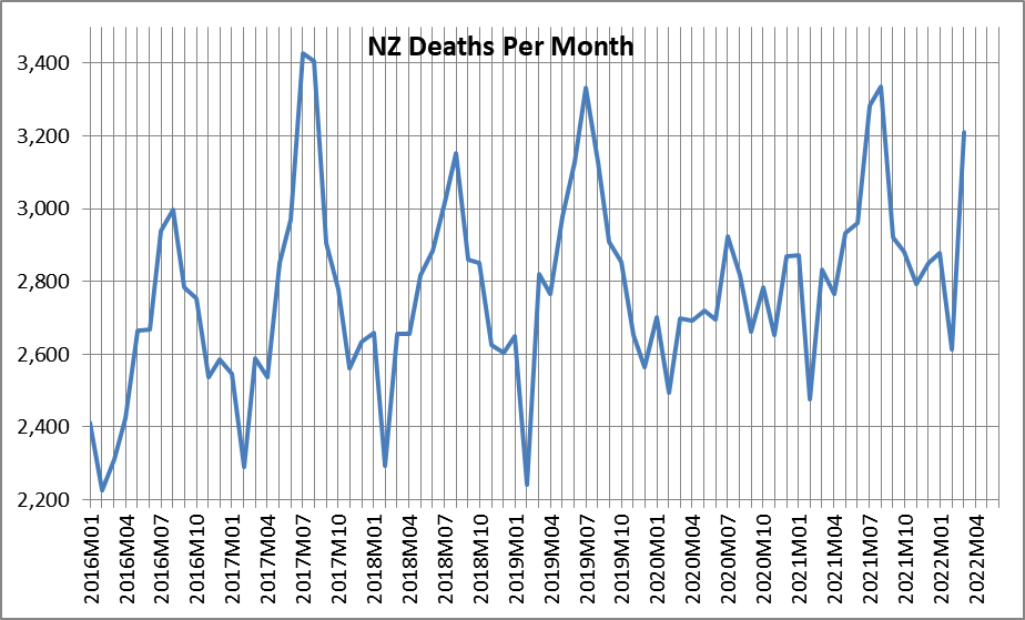 Normally, this means that deaths peak in July or August each year at up to 3,400 or more for the month, and bottom out in January or February, usually at a little over 2,400. You can see this pattern as regular as clockwork in the graph below for the years 2016 to 2019. I have started the vertical axis at 2,200 to make the pattern easier to see.