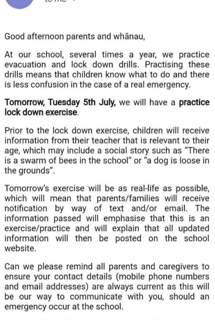 On the week of 25 July 2022, a series of anonymous bomb threats were made to a number of New Zealand schools. This occurred coincidentally around the time that some had been practising lockdown procedures.