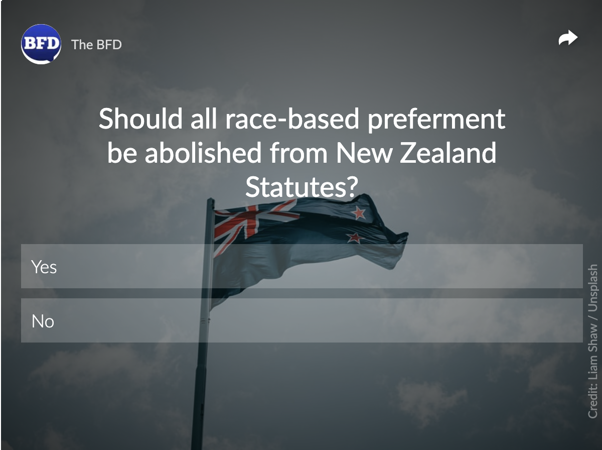 Let’s join together and fight for a colour-blind society where all New Zealanders are equal in the eyes of the law, with all race-based preferment abolished.
