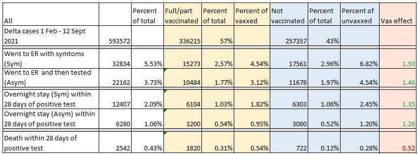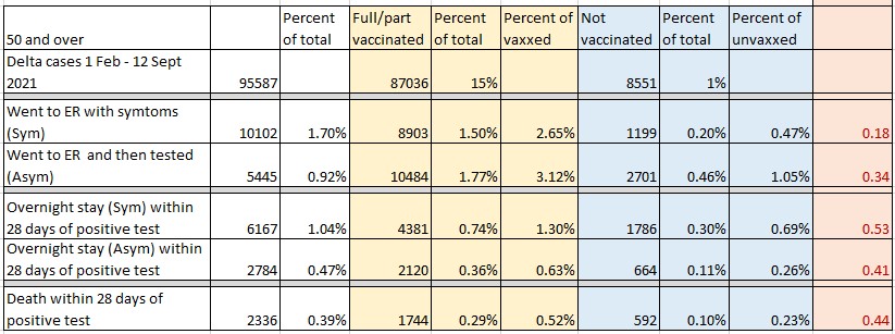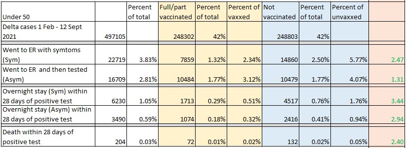 For the under 50s the unvaccinated are 2.5 times more likely to turn up at ER with symptoms and 3.4 times more likely to be admitted and 2.4 times more likely to die within 28 days.