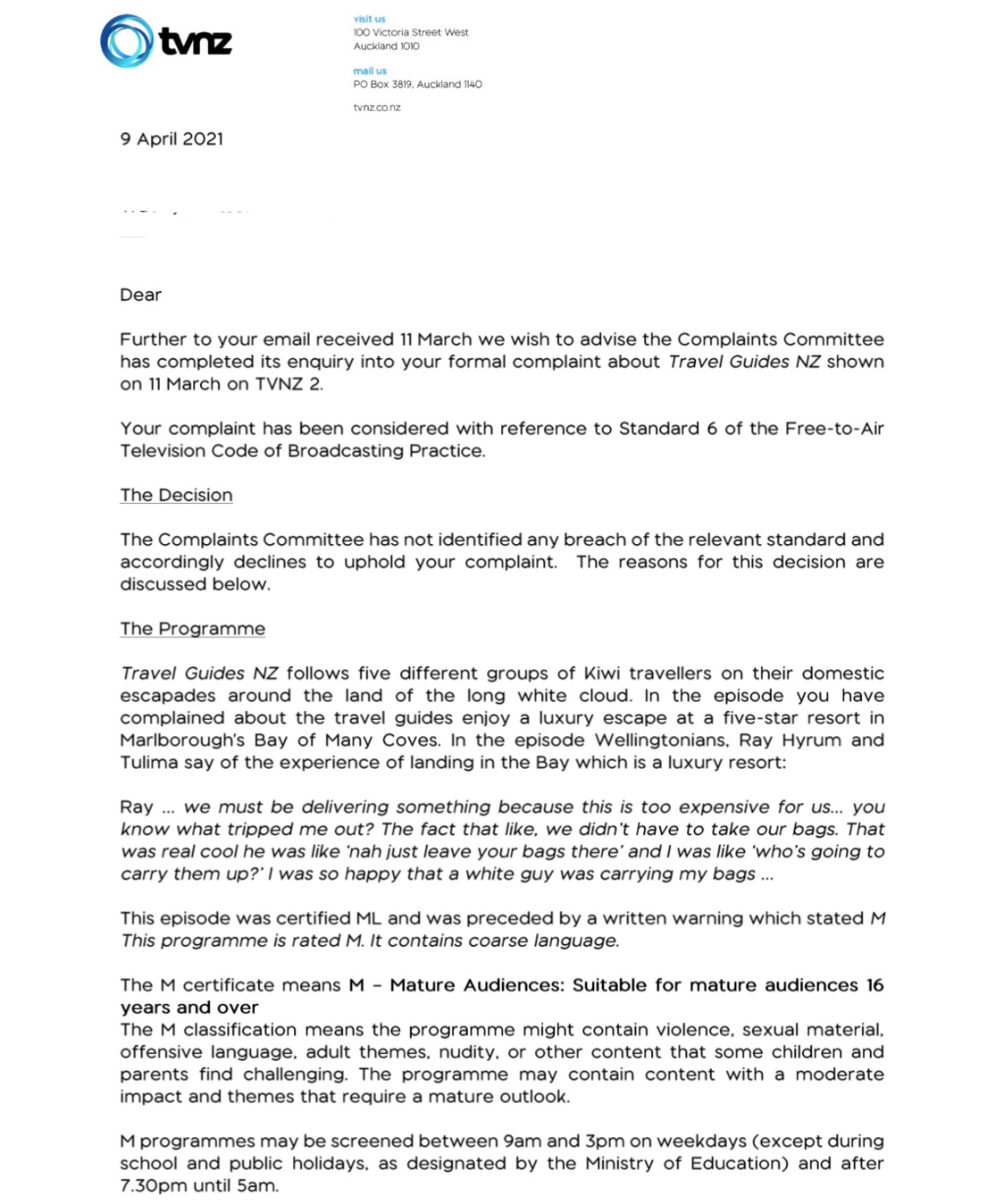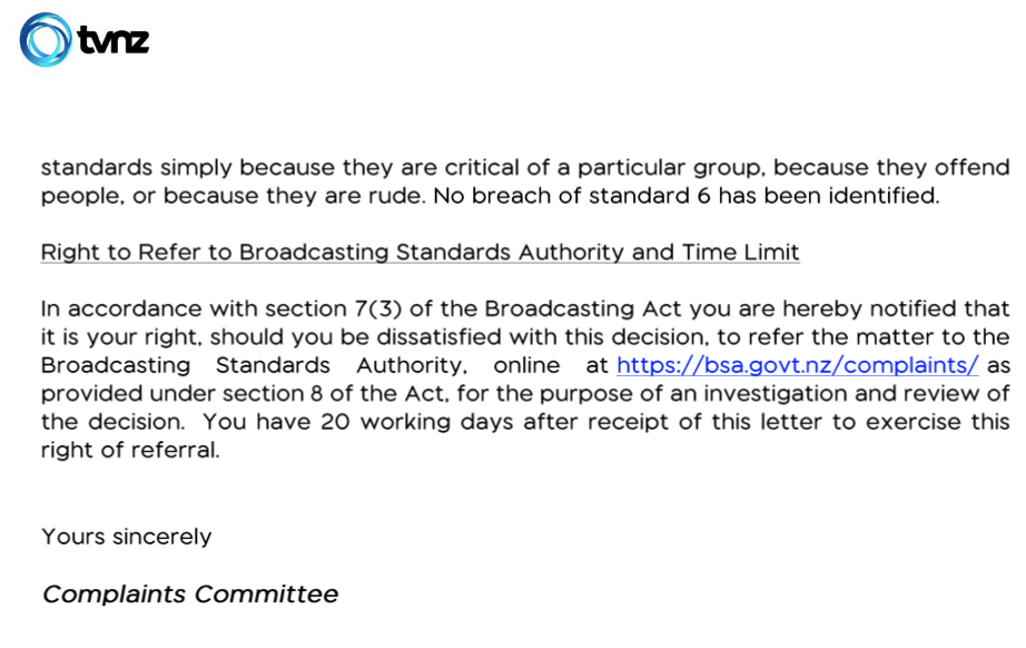 To our reader’s great surprise the complaints committee did not identify any breach of standards by the broadcasting of the racist comment because the show was rated M. Apparently a racist comment is considered coarse language.