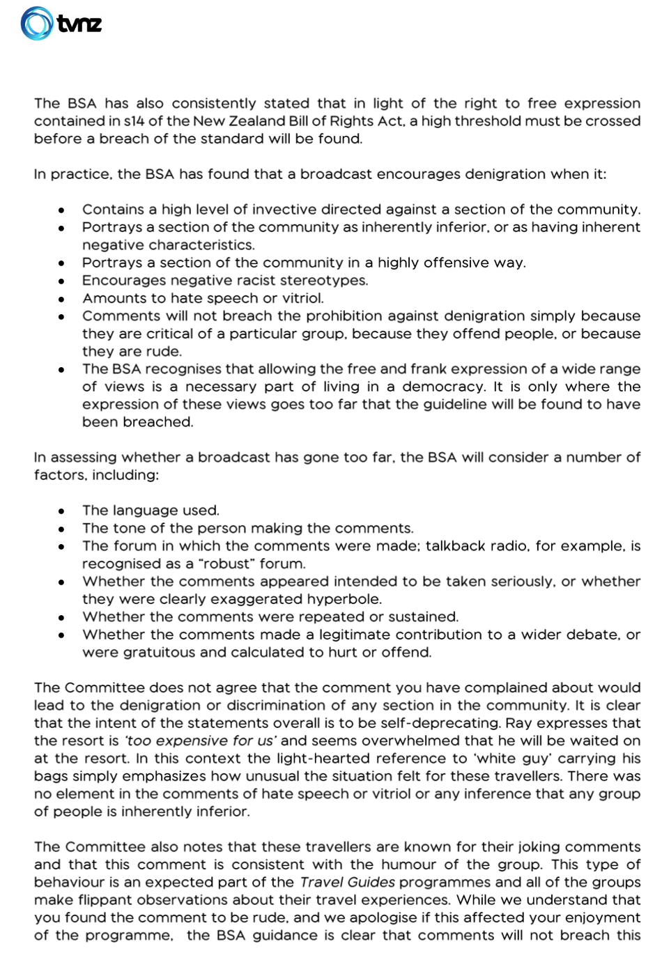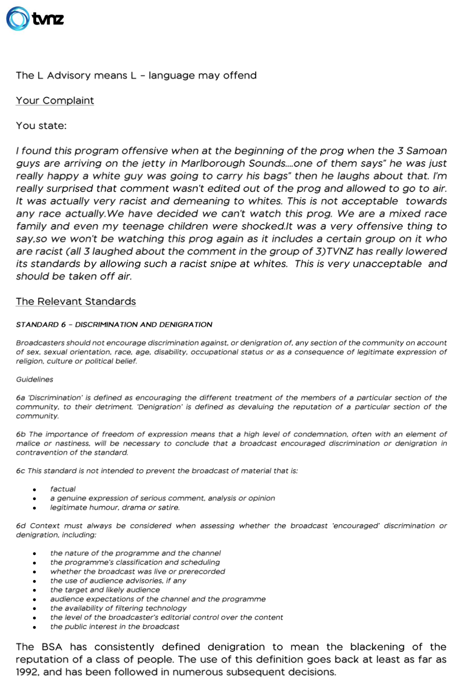 A regular reader of The BFD recently complained to TVNZ about a racist comment that had been broadcast in March. On the show in question, a white guy who was part of a group of white guys commented that he was so happy that a black guy was carrying his bags.