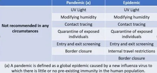 Page 3 of the World Health Organization’s own 2019 systematic review of the evidence includes Table 1: Recommendations on the use of non pharmaceutical interventions by severity level in which contact tracing, quarantine, border screening and closures all come under the category of “not recommended in any circumstances.“