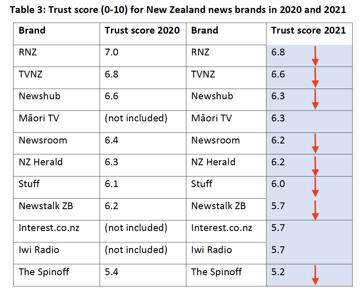 The local survey of 1200 people, run online nationwide by Horizon Research in March on behalf of AUT’s research centre for Journalism, Media and Democracy found all news brands here experienced erosion in trust over the 12 months, with Newshub and Newstalk ZB suffering ‘statistically significant’ falls.