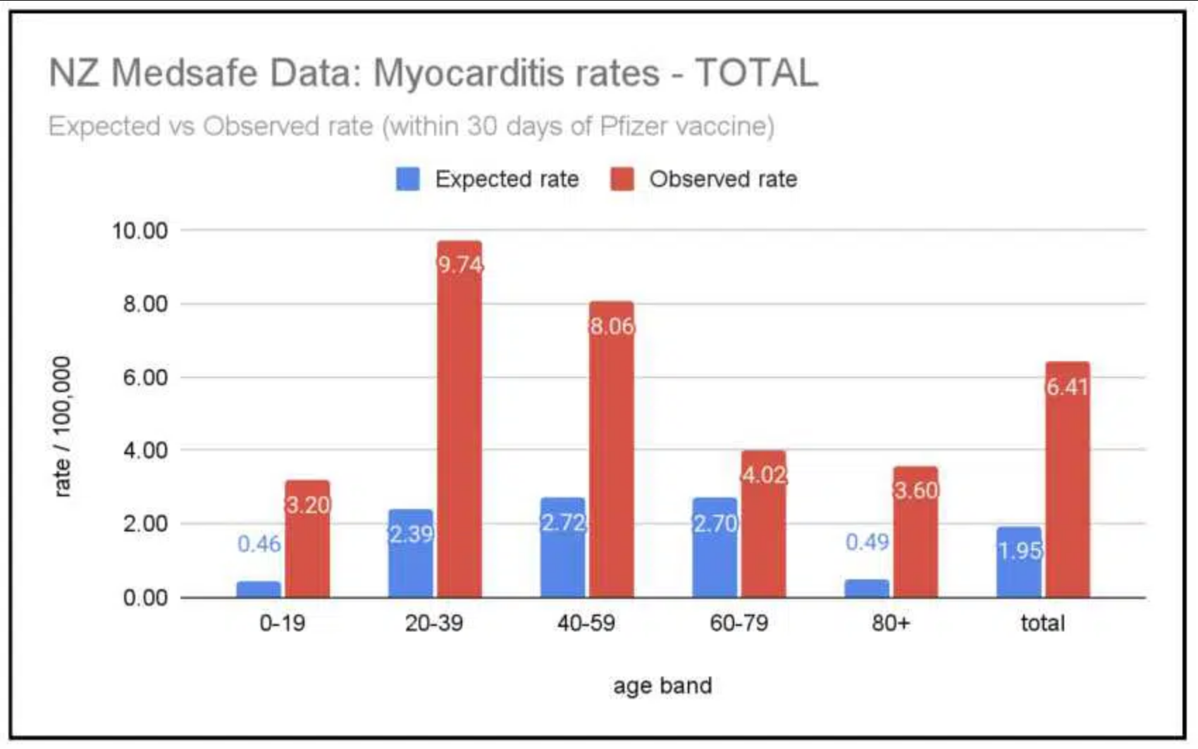 Medsafe publishes an Adverse Events Following Immunisation (AEFI) spreadsheet. We have extracted figures for myocarditis rates current to 22 February 2021. This shows that the actual incidence of myocarditis for under 40 year olds is between 4 to 7 times higher than the expected rate per 100,000 vaccinations. Considerably higher than Dr. Bloomfield hoped.
