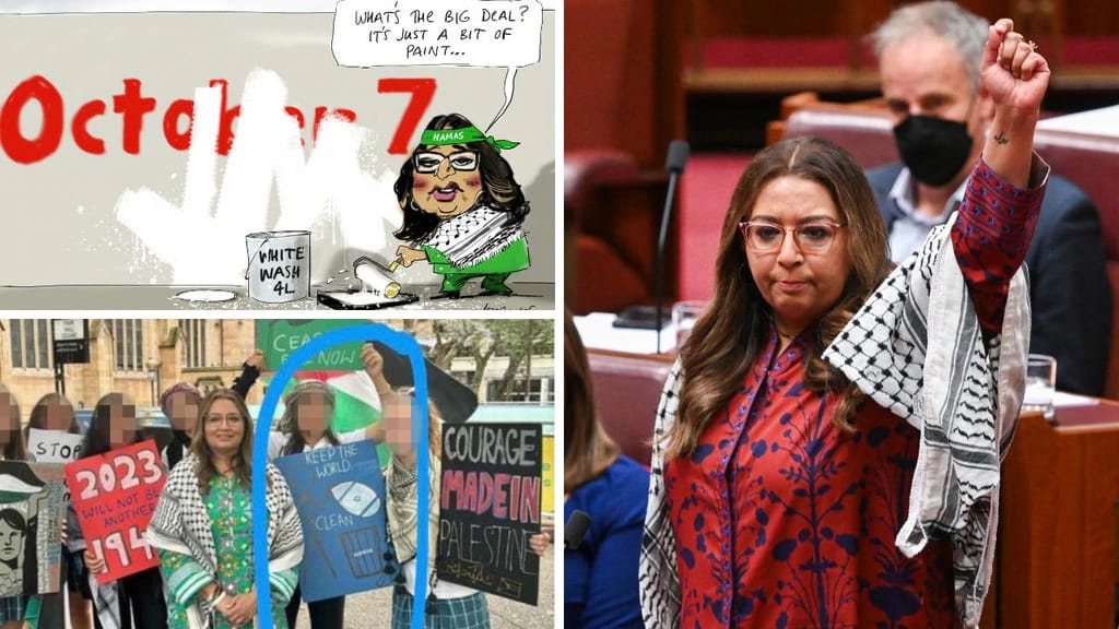 Faruqi used almost those exact words to dismiss a vandalism attack on the Australian War Memorial by pro-Hamas activists. She is never seen anywhere these days without her pallyrag. She posed for a since-deleted photo with activists holding anti-Semitic placards. She refused repeatedly to concede whether or not Hamas should be dismantled.