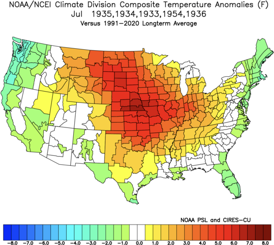 “An EPA analysis compiled from 1895 through 2015 ranks 1936 as the worst on record, with an index value of 1.255. The hottest year in recent decades, 2011, has an index of 0.285. In 1936, some areas experienced 22 heatwave days and maximum temperature anomalies that exceeded six degrees Celsius.”