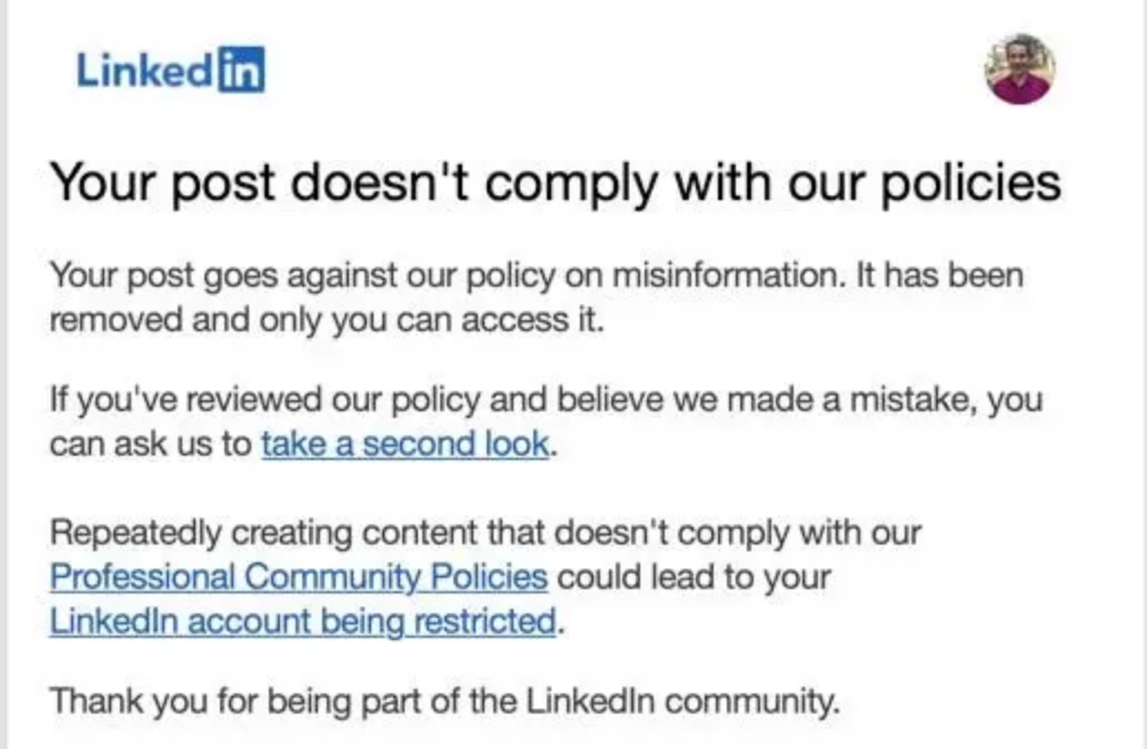 My latest run-in with the social media Information Tsars was an email I received on July 17 from Linkedin, notifying me that they had removed one of my posts for violating their policies on “misinformation,” and threatening to restrict my account if I continued to violate their policies. After posting a complaint about LinkedIn’s misinformation policies, I could no longer access my account, as it had been “temporarily restricted.” As I write this, I am still locked out of my LinkedIn account.