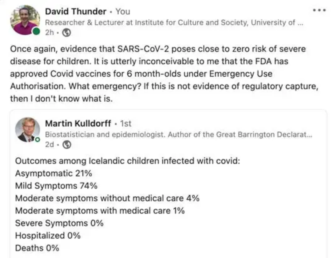 Actually, nothing more than (i) cite a scientific study being shared by a Harvard epidemiologist, corroborating many other studies that have shown, time and again, that children are at negligible risk of suffering severe disease from Covid-19, and (ii) question the wisdom and ethical propriety of an FDA decision to approve Emergency Use Authorisation for Covid vaccines for children as young as 6 months old.