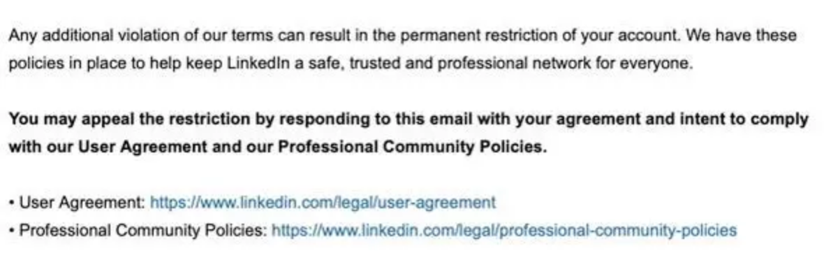 According to correspondence I have received from Linkedin, “We have these policies in place to help keep LinkedIn a safe, trusted and professional network for everyone” (email from “LinkedIn Member Safety and Recovery Consultant,” received 19 July 2022, excerpted below).