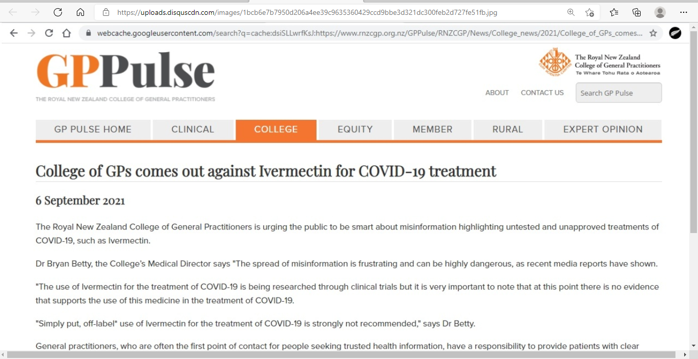 This is not the letter from Dr. Bryan Betty, however, it is an article about that letter. You can clearly see the same sentence quoted at the top of my article. GPPulse is part of the RNZCGP website [4]. The article in the image above also appears to have been removed, and a search of GPPulse with key word “Ivermectin” returns no results.