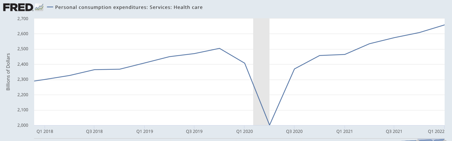Early on, an edict came out in every part of the country to shut the hospitals to everyone who didn’t have an emergency reason to be there, while prioritising Covid in the name of ending the pandemic. This happened all over the US. It was an action without precedent. And in the places without Covid of any substantial degree hospital parking lots emptied, hospital revenue collapsed and hundreds of nurses were furloughed. Healthcare spending (in a pandemic!) plummeted.