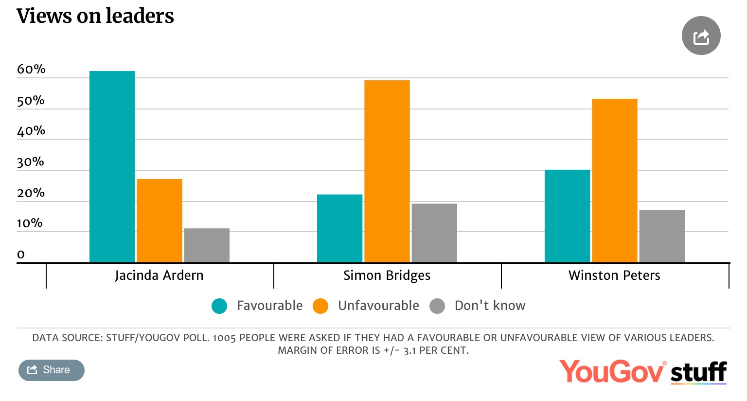 Poor Simon Bridges isn’t getting it or getting there (wherever there is). 59% unfavourable to 22% favourable – gosh – he’s nearly as unfavourable as Ms Ardern is favourable. And then there’s Peters, marginally behind with 53% unfavourable and 30% favourable.